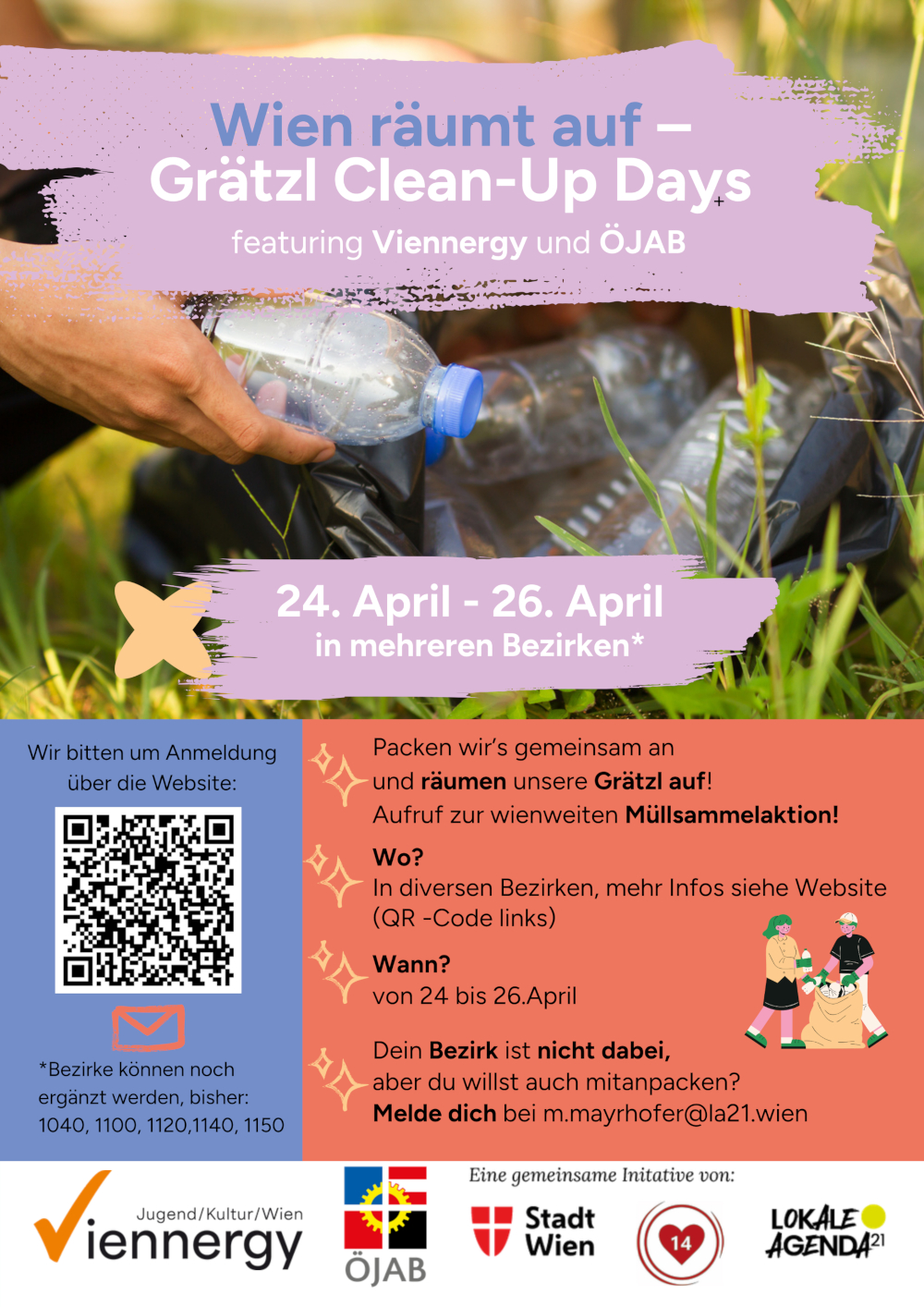 Nach dem großen Erfolg der letzten Jahre organisieren wir auch heuer wieder eine Aktion zum gemeinsamen Müllsammeln in verschiedenen Bezirken. Dieses Mal auch mit der Unterstützung der Grätzl Labore und der ÖJAB